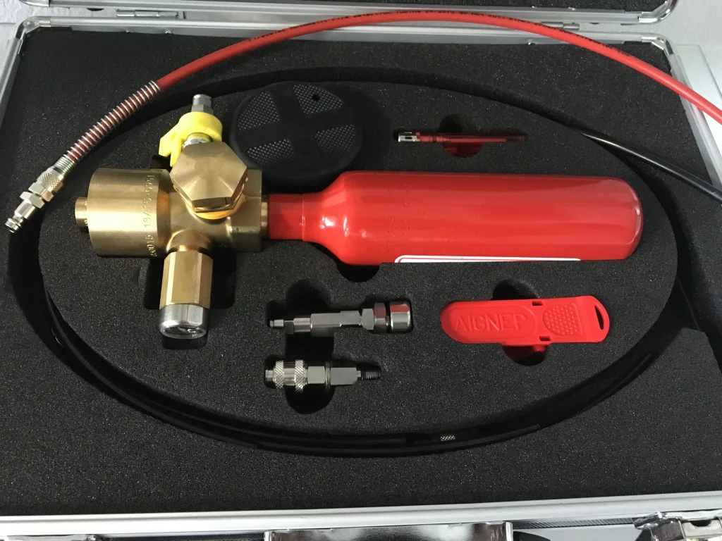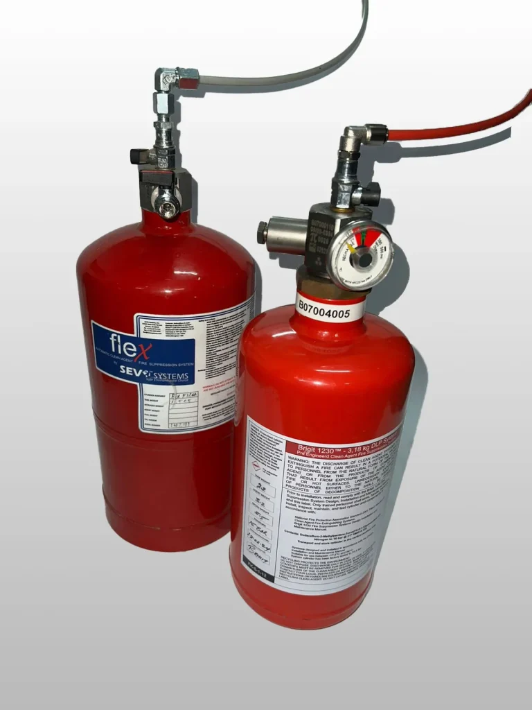 When a fire is detected, the system releases the suppression agent (Novec 1230 or HFC-227ea) through the flex tube into the cabinet